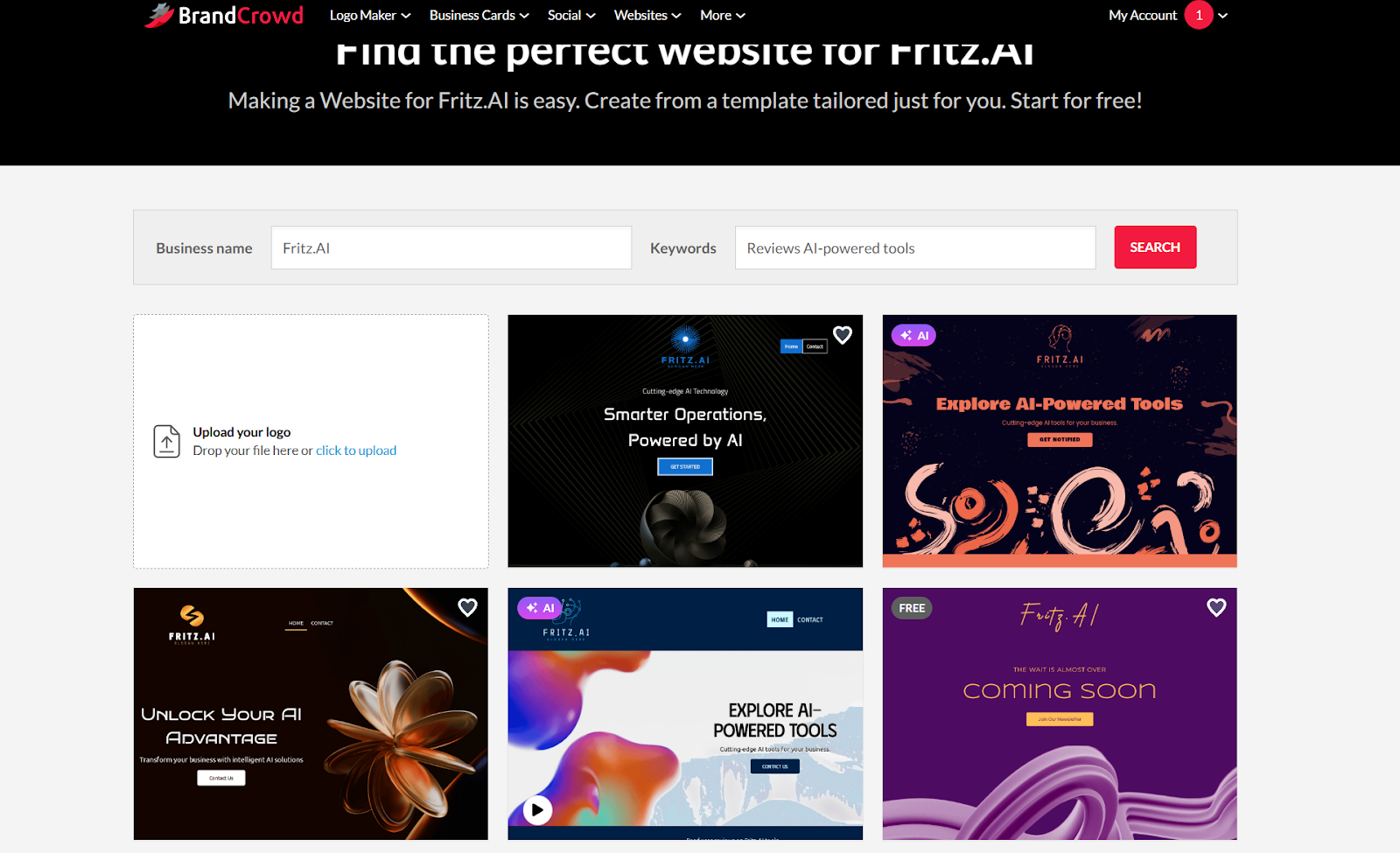 If you haven’t created a logo already, BrandCrowd will ask you to describe your business again before suggesting a few website templates. If you have a logo, you can upload it, and the AI system will infuse that into the suggestions.