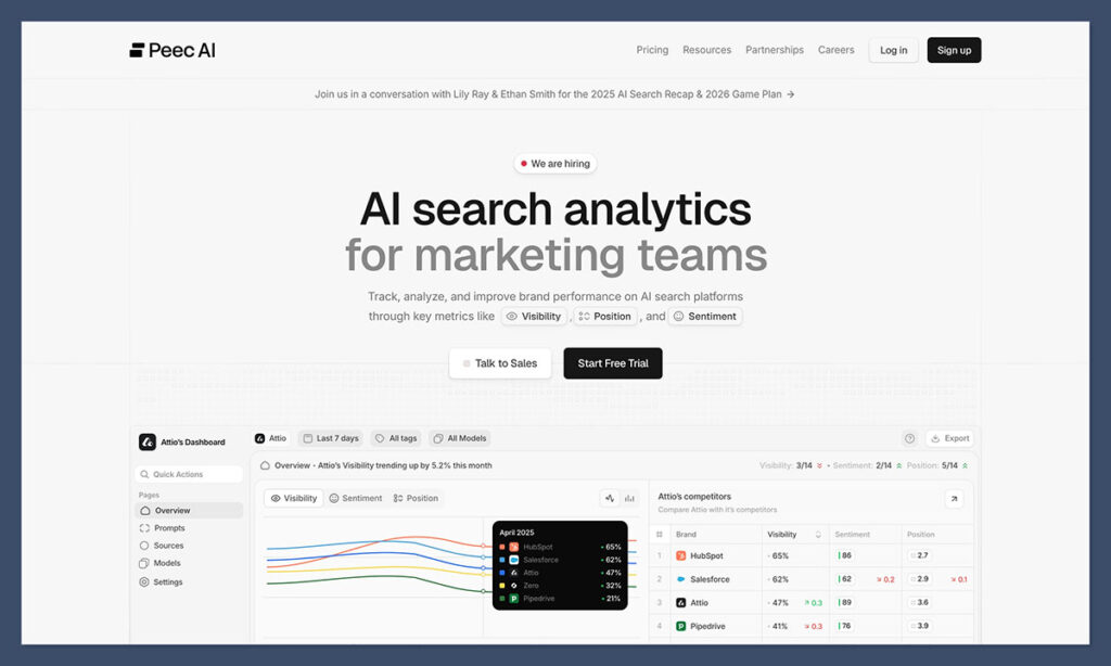 We recommend Peec AI if you want to double down on AI-first visibility, LLM prompt tracking, and brand monitoring in real time.